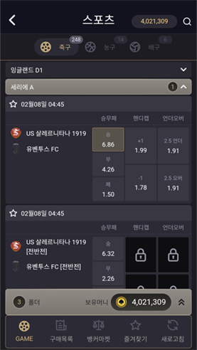 GAME 메뉴에서는 진행 예정중인 게임을 선택하여 승무패/핸디캡/언더오버로 예상하여 배팅하세요.